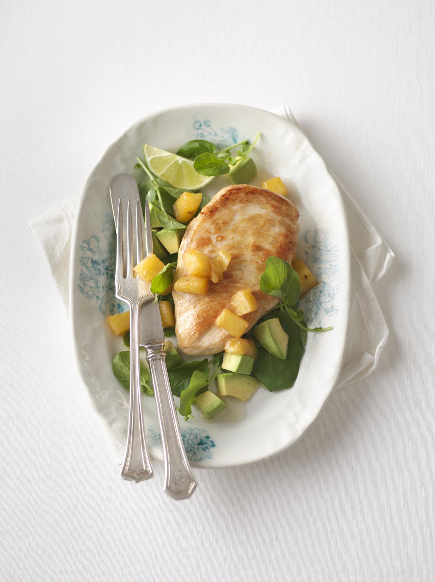 - Arrange watercress and avocado on plates. Top with chicken, then spoon pineapple and pan juices on top. Cut remaining lime half into wedges to garnish salads.