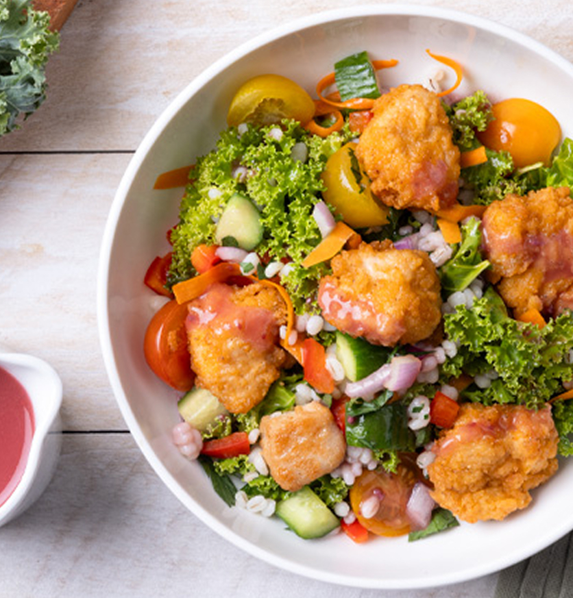 A French classic gets a modern (and crispy) twist. Instead of tuna, this Nicoise features golden Just Bare Lightly Breaded Chicken Breast Fillets for added crunch and flavor. It’s layered with all the traditional fixings: tender green beans, soft-boiled eggs, baby potatoes, and grape tomatoes – finished with a zippy Dijon vinaigrette.