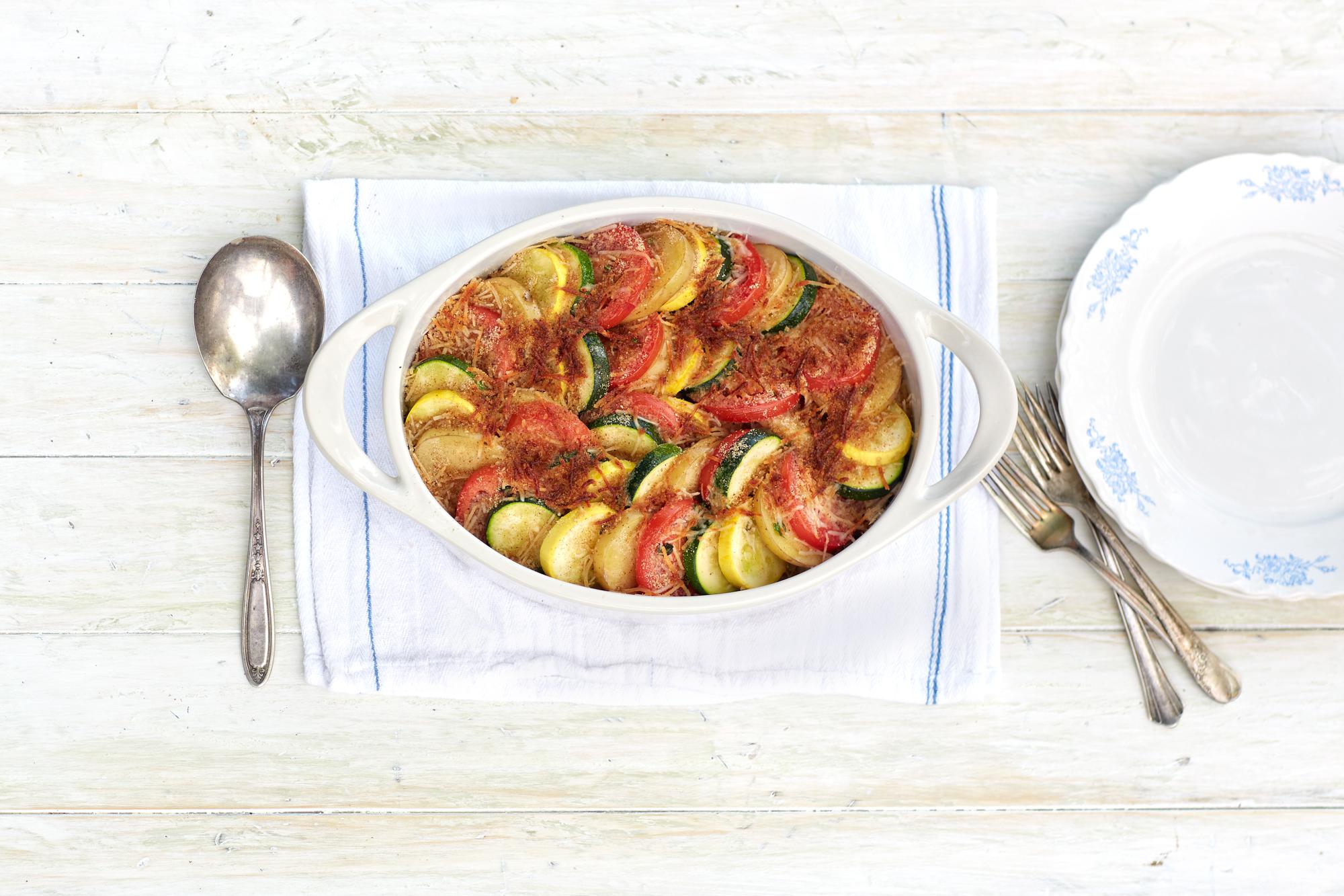 In southern France a “tian” refers to both an earthenware casserole and the actual vegetable-centric dish. A tian is a wonderful way to make the most of summer produce and leftover chicken; use this version as a base for jumping off to create your own favorite combinations.