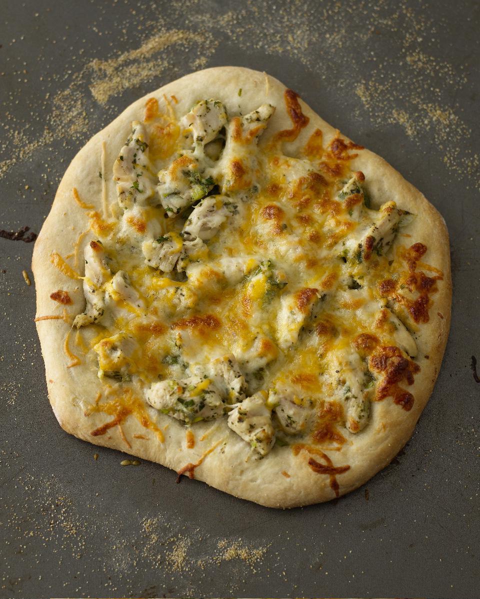 Pierce any puffed areas of dough with the tip of a knife, then top with chicken-pesto mixture and cheese. Bake, covered, for a few minutes longer—just until the cheese is melted.