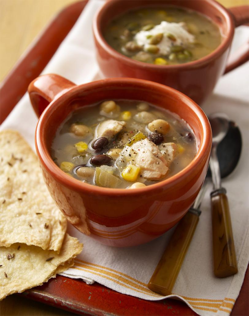 This non-traditional chili takes advantage of the later summer harvest: jalapeño chiles, corn, zucchini, fresh oregano, rosemary, and cilantro. Don’t let the list of ingredients discourage you—pile them into a big soup pot and simmer for less than an hour for a great all-in-one supper.