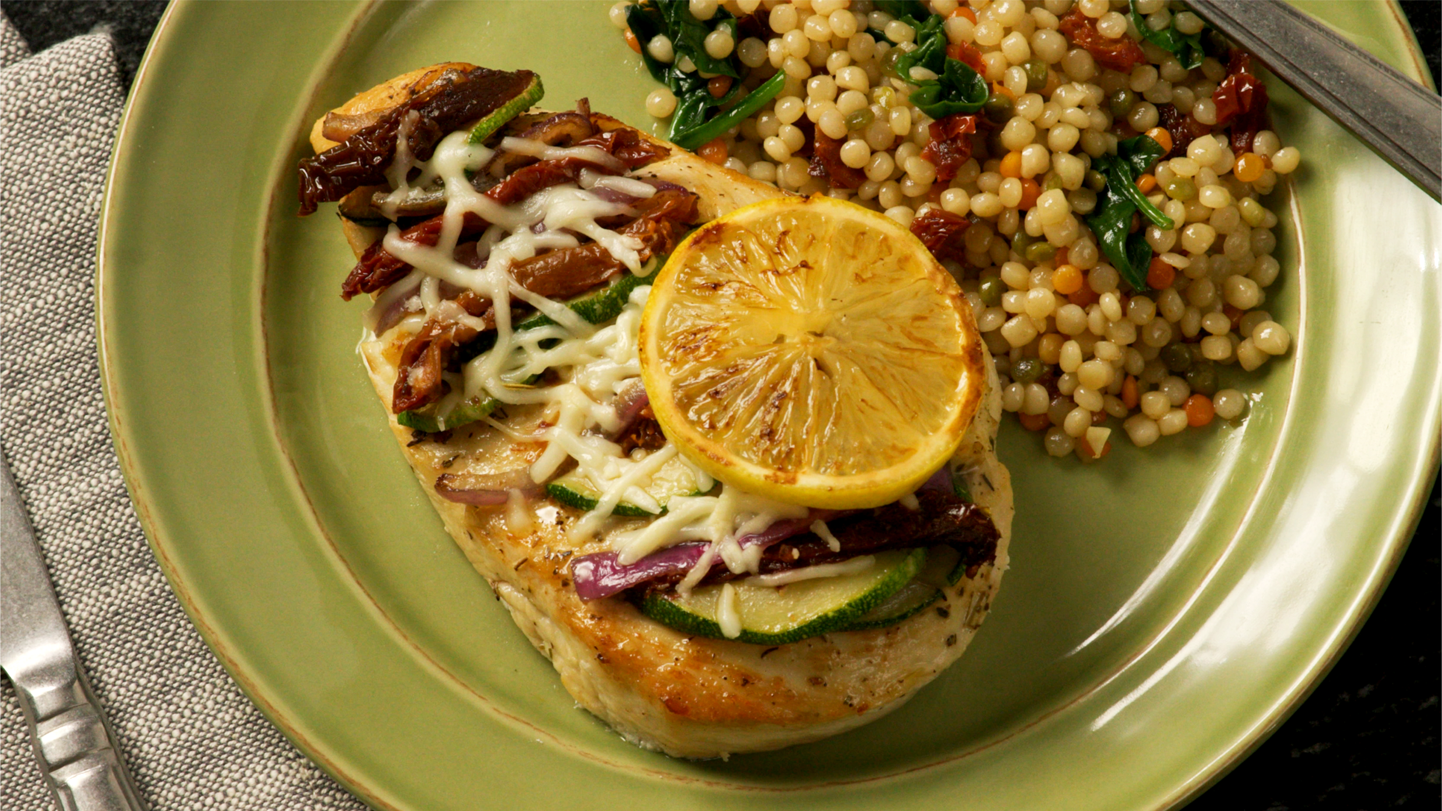 Layered with zucchini, sun-dried tomato and red onion, this dish is packed with veggies and plenty of lean proteins. Finish with mozzarella cheese, a squeeze of lemon and this meal will have you getting up for more!
