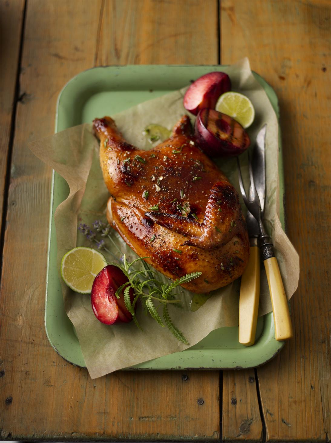 Squeeze a few chunks of fresh lime or lemon over the finished bird and fruit. Complete the meal with a pan of quick-cooking orzo pasta tossed with some crumbled feta cheese and a bowl full of fresh arugula dressed in a vinaigrette.