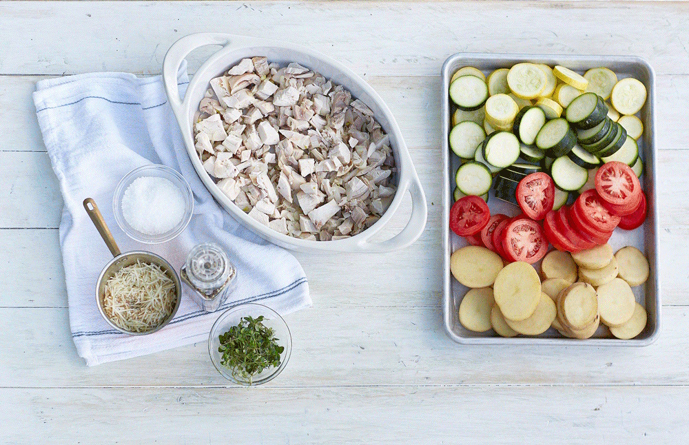 French cuisine has earned a reputation for quality over quantity. Select, well-sourced ingredients skillfully prepared and served in reasonable portion sizes set a good standard for any meal. A great way to use leftover chicken and abundant summer produce is Vegetable & Chicken Tian de Soleil. In southern France, a “tian” refers to an earthenware cooking pot and also a baked dish of chopped veggies topped with cheese. Slice the veggies, bake and serve.