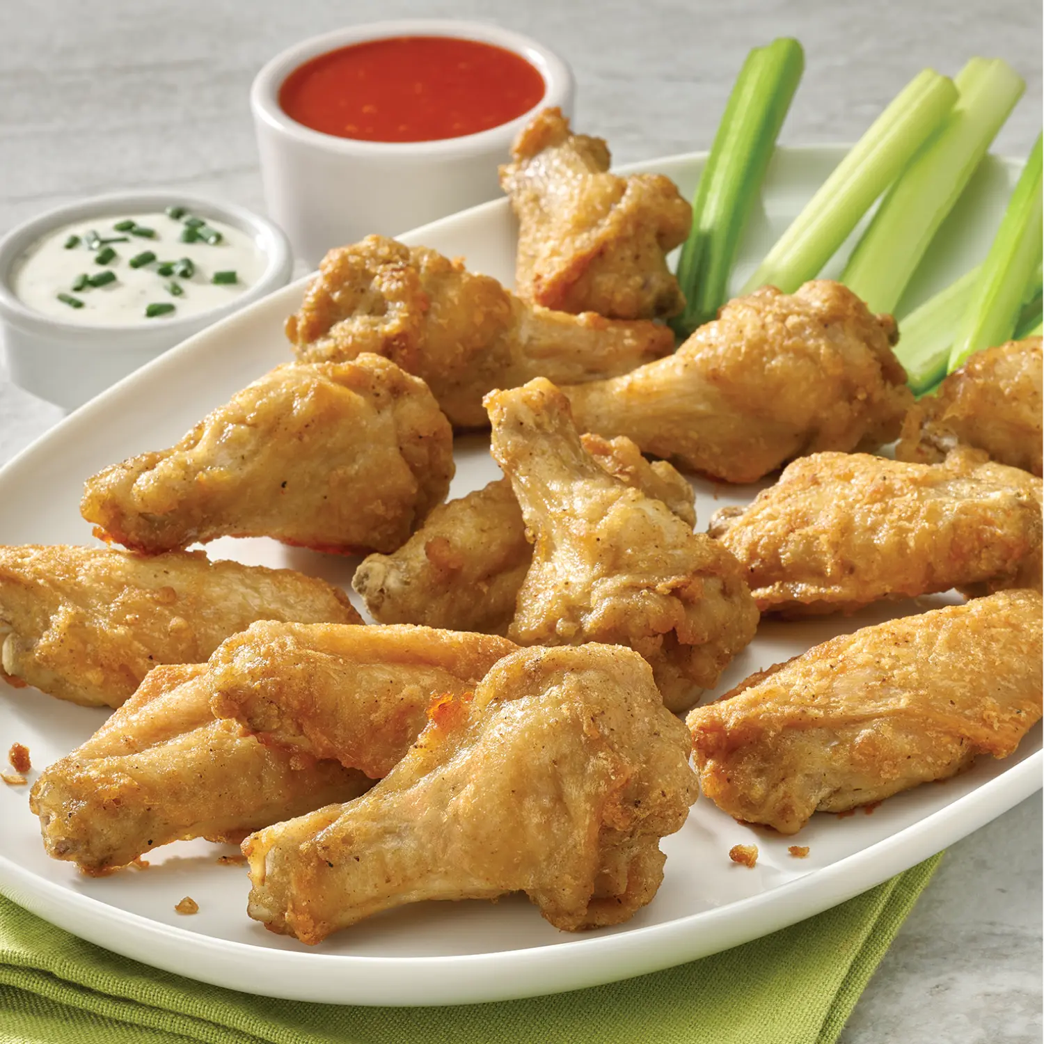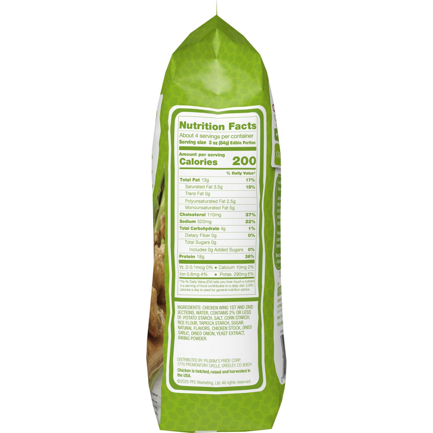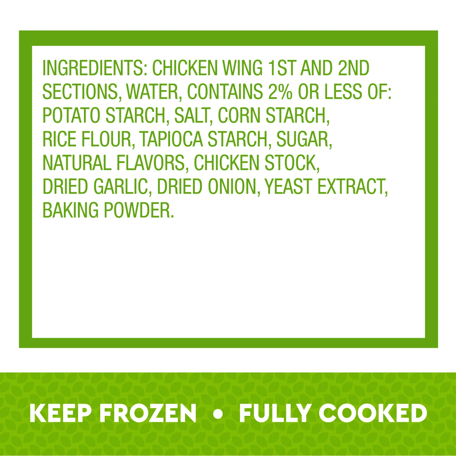 CHICKEN WING 1ST AND 2ND SECTIONS, WATER, CONTAINS 2% OR LESS OF: POTATO STARCH, SALT, CORN STARCH, RICE FLOUR, TAPIOCA STARCH, SUGAR, NATURAL FLAVORS, CHICKEN STOCK, DRIED GARLIC, DRIED ONION, YEAST EXTRACT, BAKING POWDER.