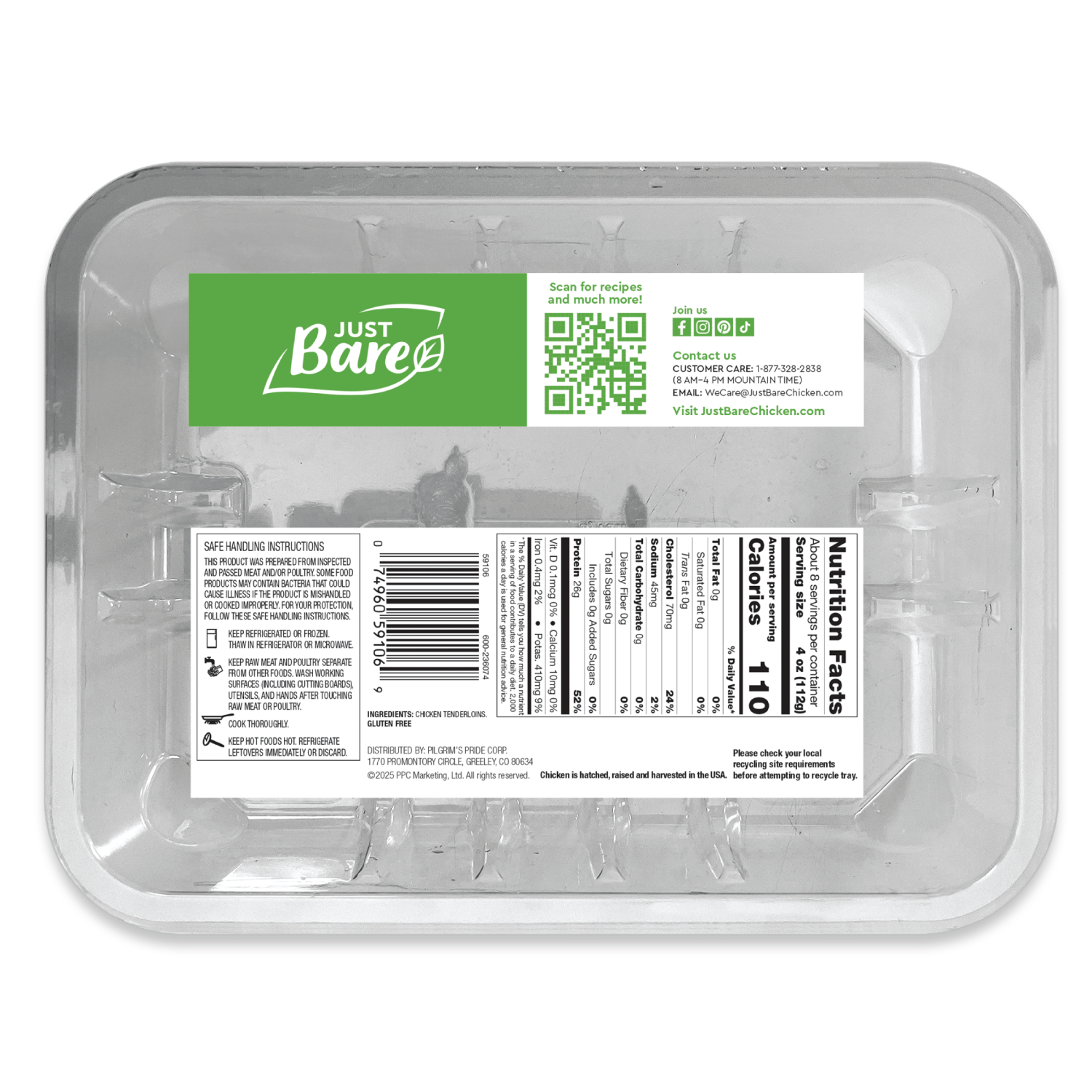 Perfect for feeding a family! Our boneless, skinless chicken breast tenderloins are ideal for a week night dinner. Try in stir-fries, fajitas, or wraps for a quick, flavorful, protein filled dinner. As always, Just Bare® provides chicken that features no antibiotics, ever*. Has no added hormones or steroids†. Uses no artificial ingredients or preservatives and uses chickens raised cage free on American farms‡.