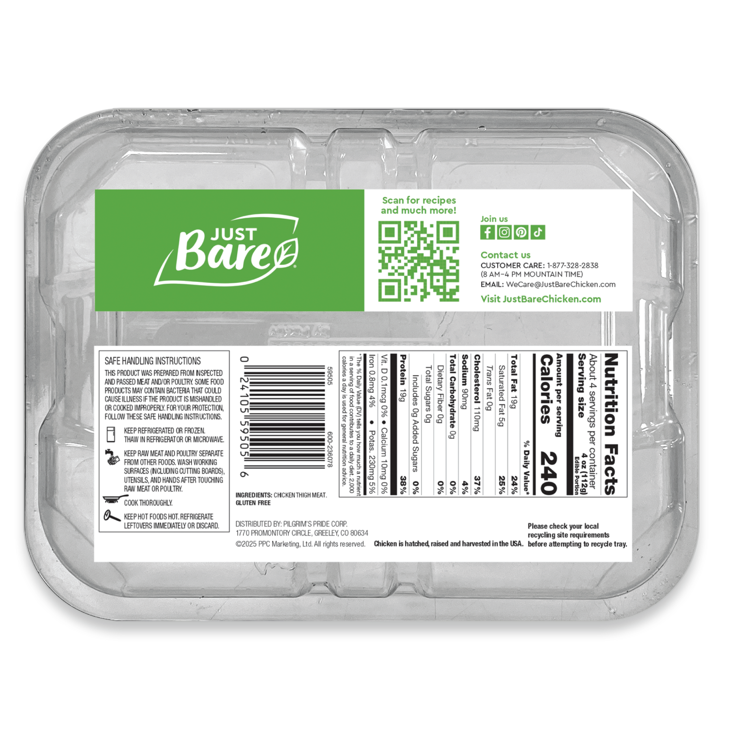 Bone-in, skin-on chicken thighs are perfect for achieving a juicy, flavorful, dinner. Pair with delicious vegetable sides and prepare for the compliments on a five star meal! As always, Just Bare® provides chicken that features no antibiotics, ever*. Has no added hormones or steroids†. Uses no artificial ingredients or preservatives and uses chickens raised cage free on American farms‡.