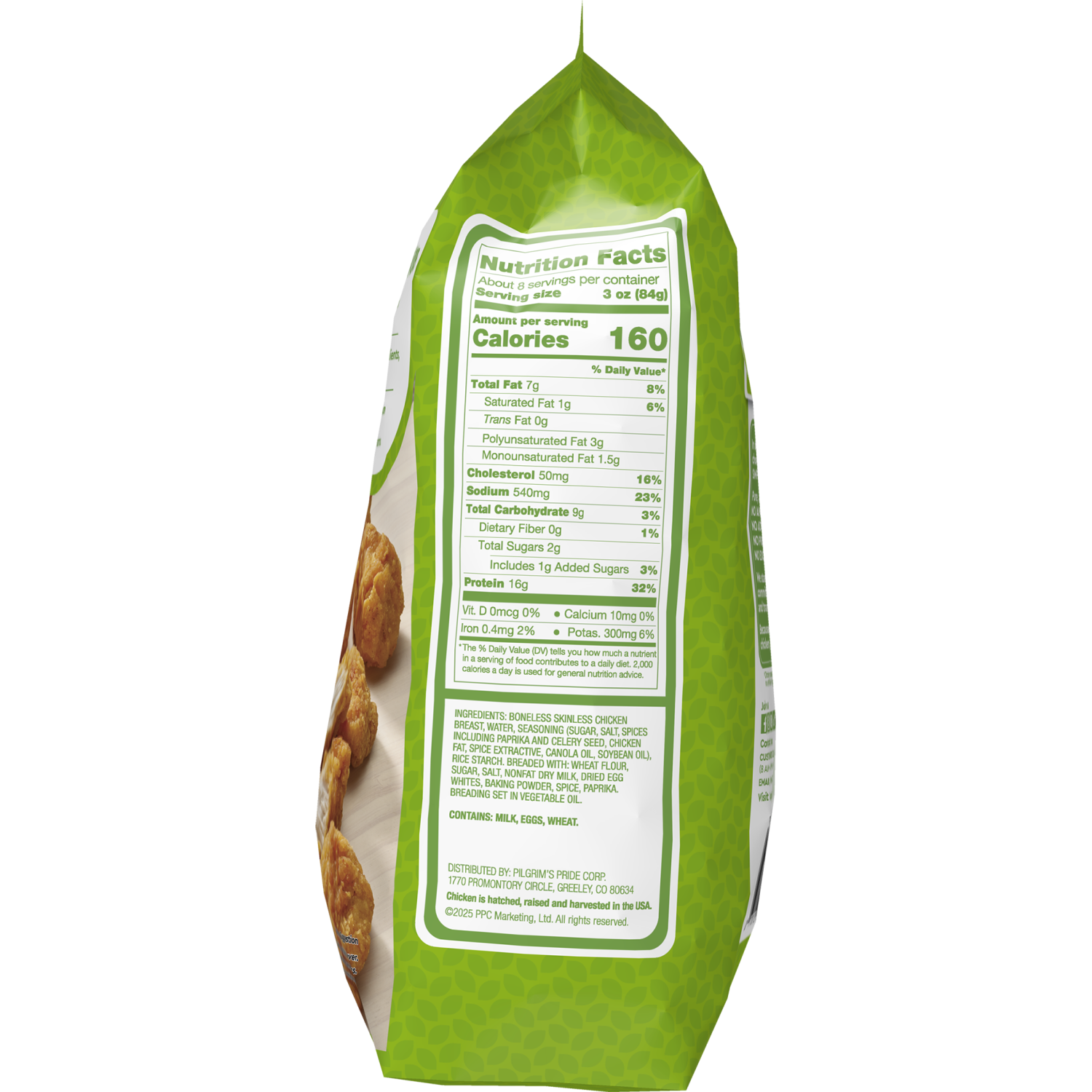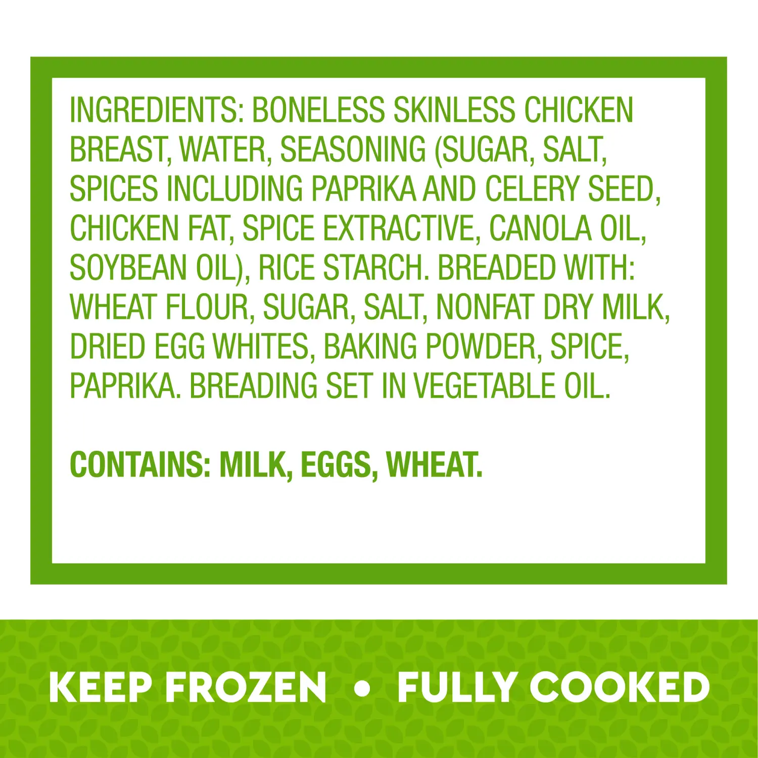 BONELESS SKINLESS CHICKEN BREAST, WATER, SEASONING (SUGAR, SALT, SPICES INCLUDING PAPRIKA AND CELERY SEED, CHICKEN FAT, SPICE EXTRACTIVE, CANOLA OIL, SOYBEAN OIL), RICE STARCH. BREADED WITH: WHEAT FLOUR, SUGAR, SALT, NONFAT DRY MILK, DRIED EGG WHITES, BAKING POWDER, SPICE, PAPRIKA. BREADING SET IN VEGETABLE OIL. Contains: Milk, Eggs, Wheat