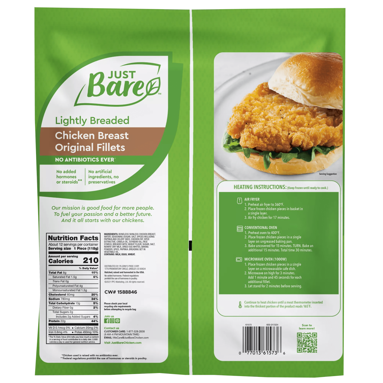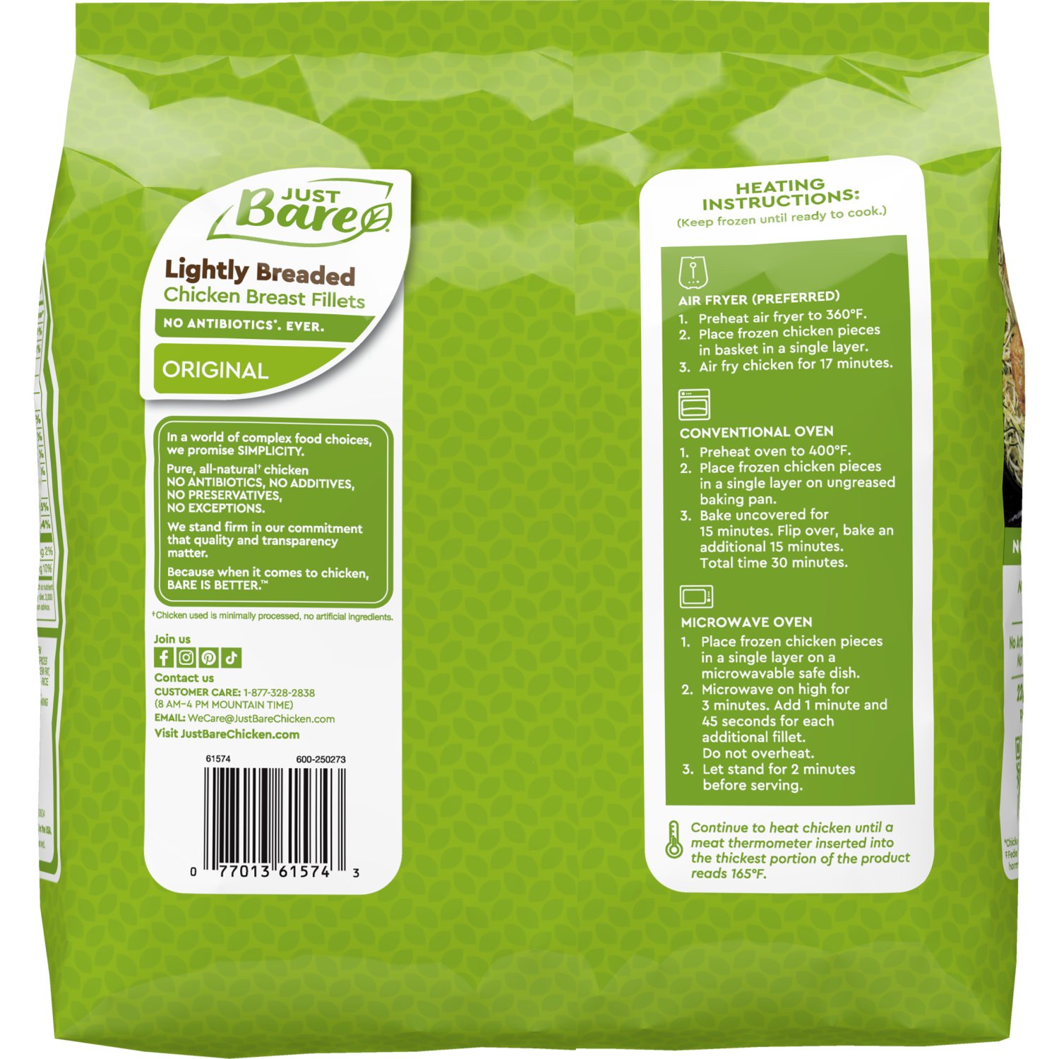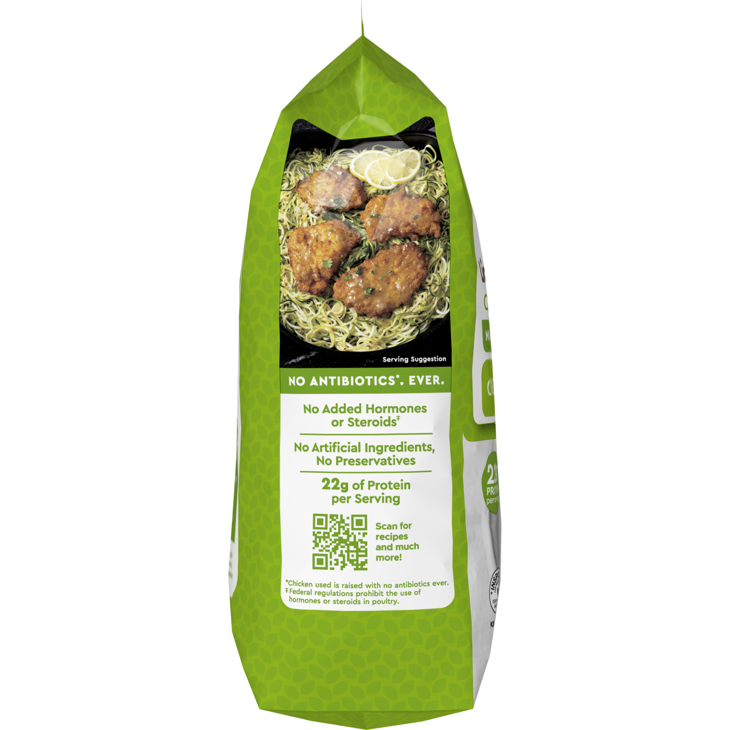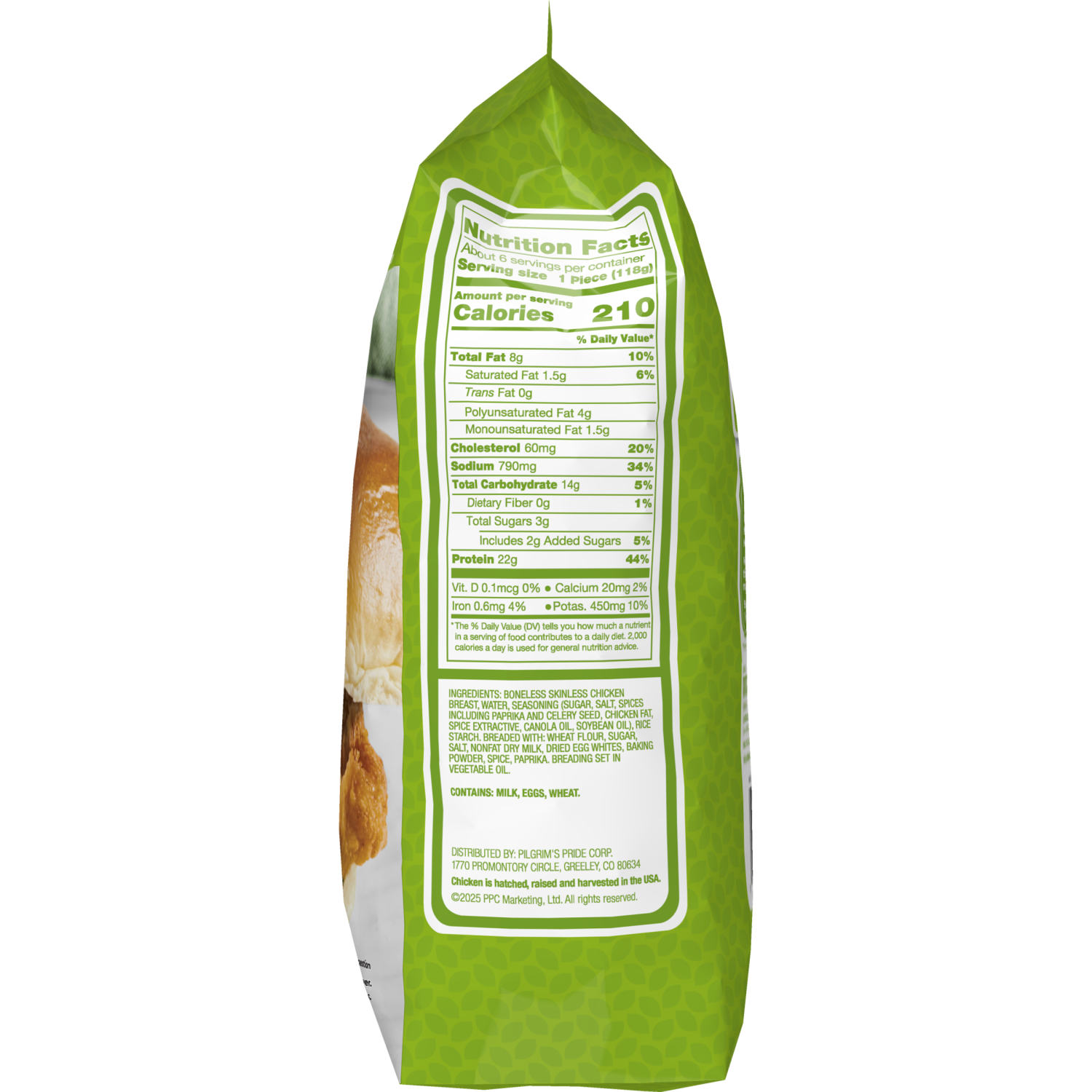BONELESS SKINLESS CHICKEN BREAST, WATER, SEASONING (SUGAR, SALT, SPICES INCLUDING PAPRIKA AND CELERY SEED, CHICKEN FAT, SPICE EXTRACTIVE, CANOLA OIL, SOYBEAN OIL), RICE STARCH. BREADED WITH: WHEAT FLOUR, SUGAR, SALT, NONFAT DRY MILK, DRIED EGG WHITES, BAKING POWDER, SPICE, PAPRIKA. BREADING SET IN VEGETABLE OIL. Contains: Milk, Eggs, Wheat