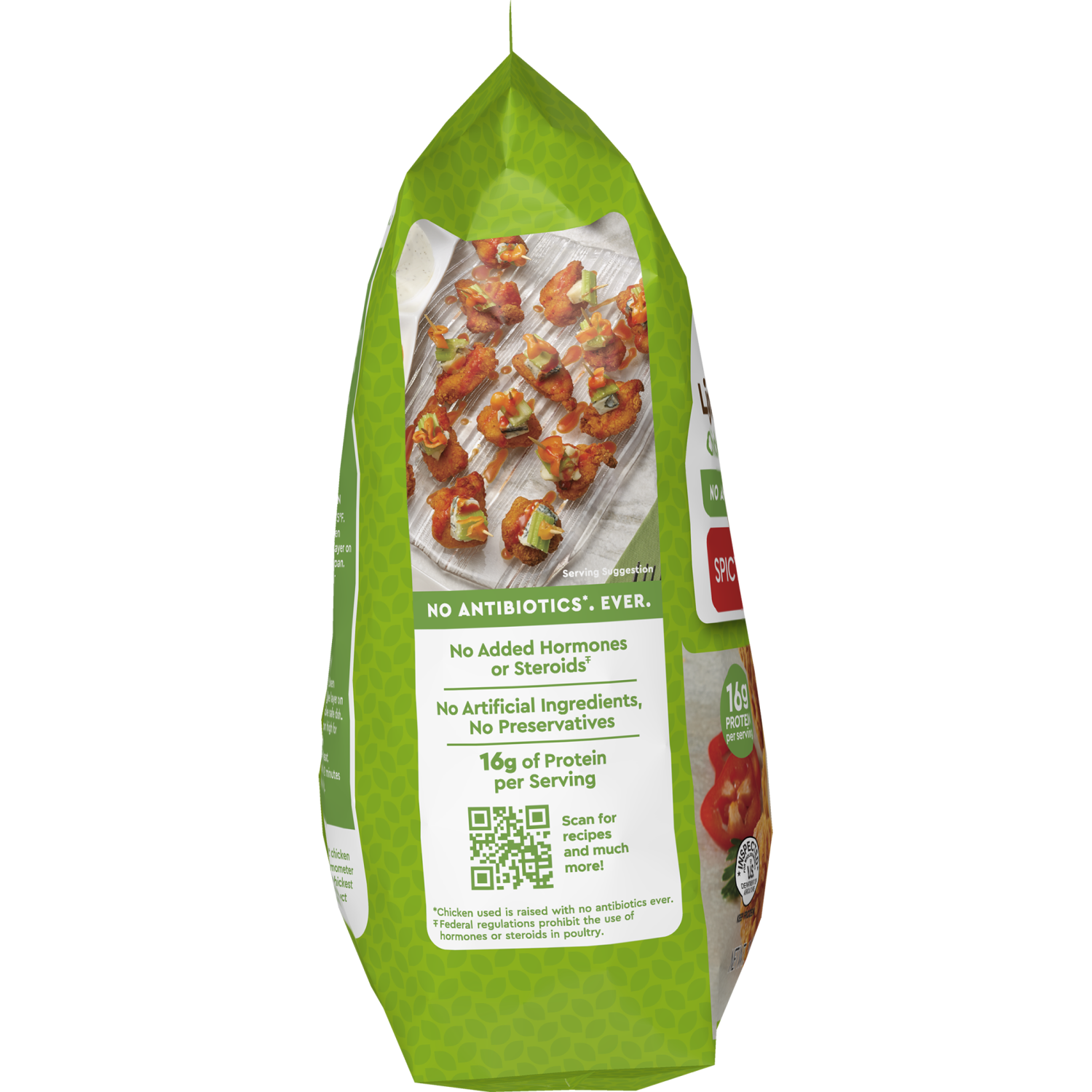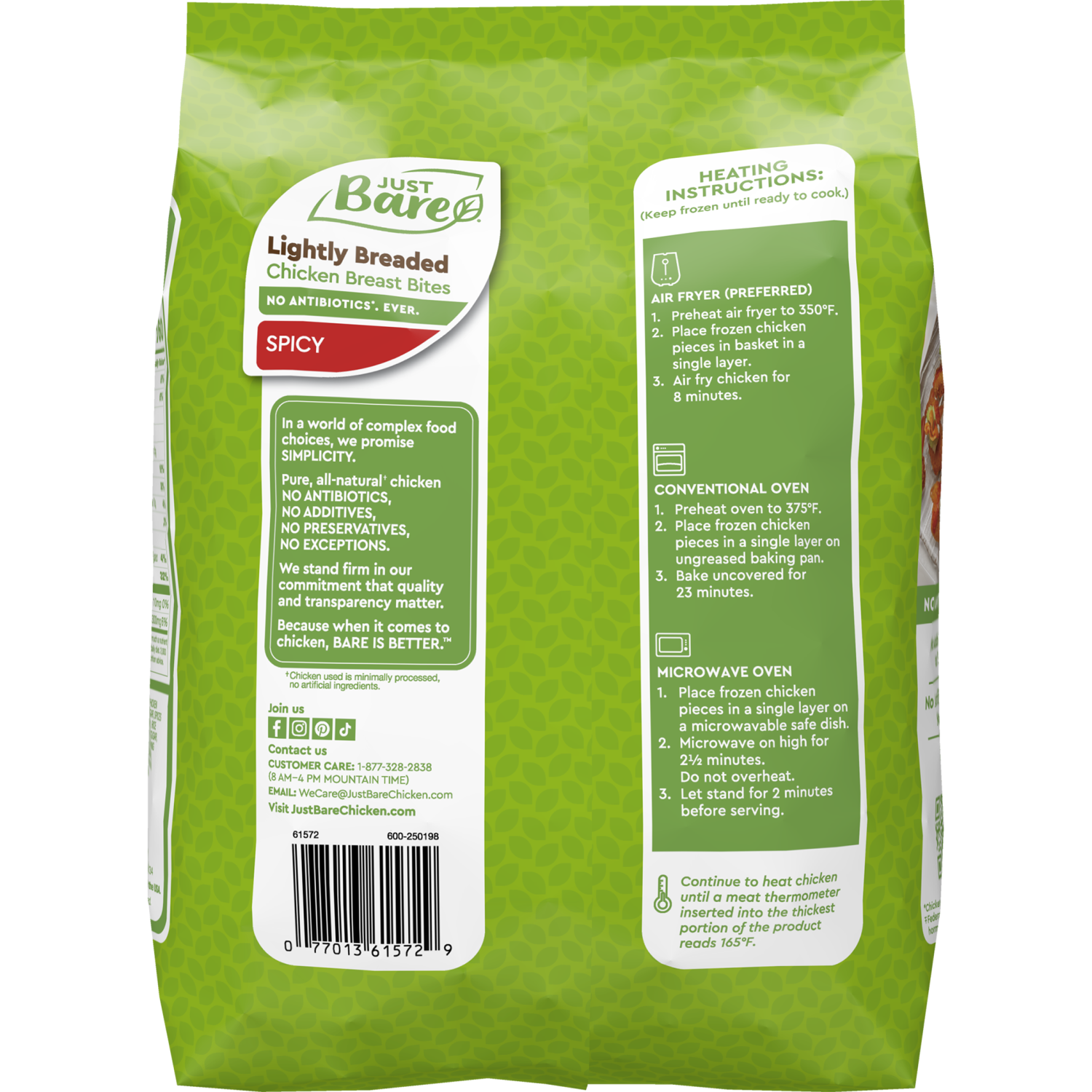 Our frozen, fully cooked Lightly Breaded Chicken Breast Spicy Bites are made with boneless chicken breast, marinated and breaded in a spicy southern style for a peppery and slightly sweet heat. They’re crispy, crunchy and packed with protein. Just heat and serve on top of salads and entrees, in mini sliders or alone with your favorite dipping sauces! As always, Just Bare® provides chicken that features no antibiotics, ever*. Has no added hormones or steroids†. Uses no artificial ingredients or preservatives and uses chickens raised cage free on American farms‡.