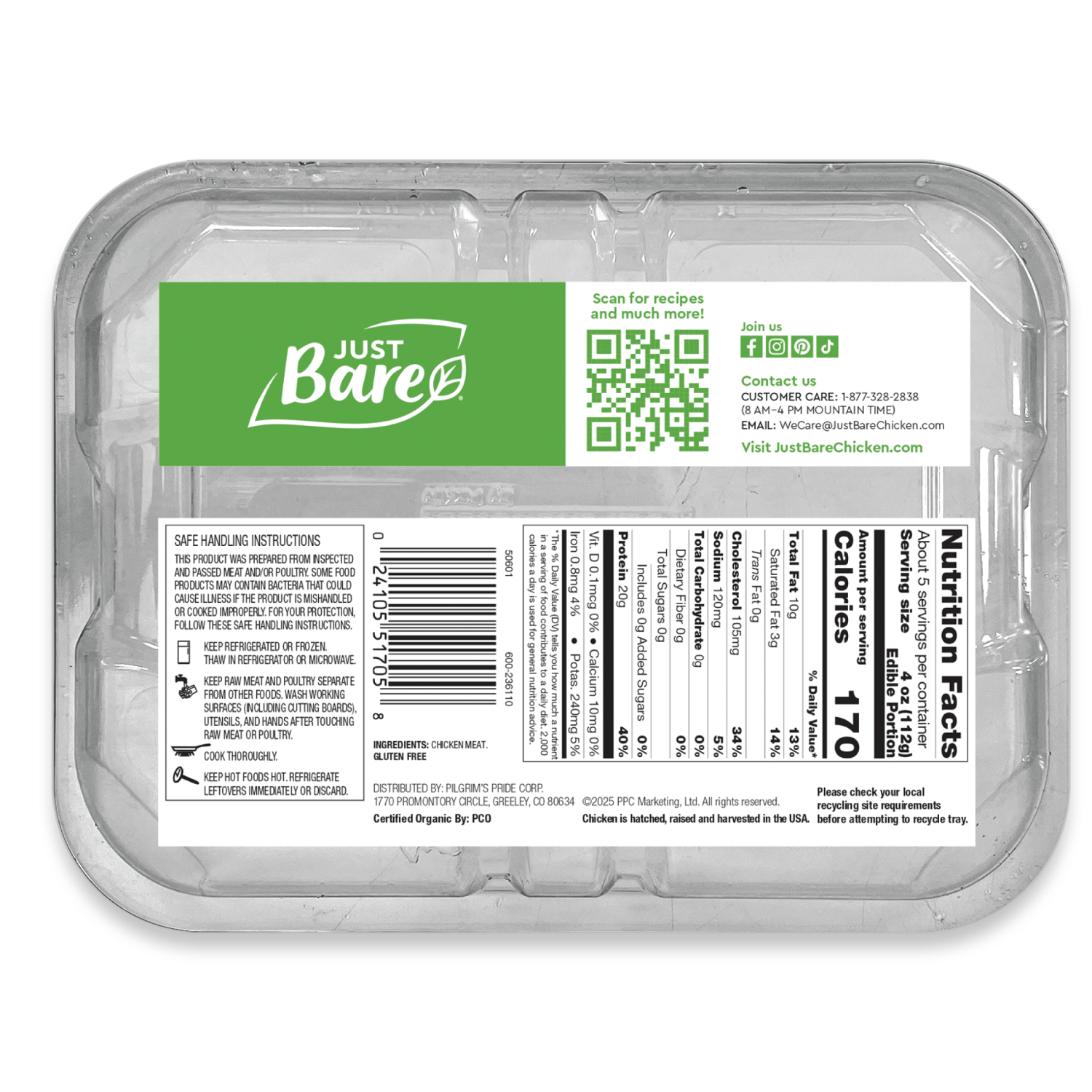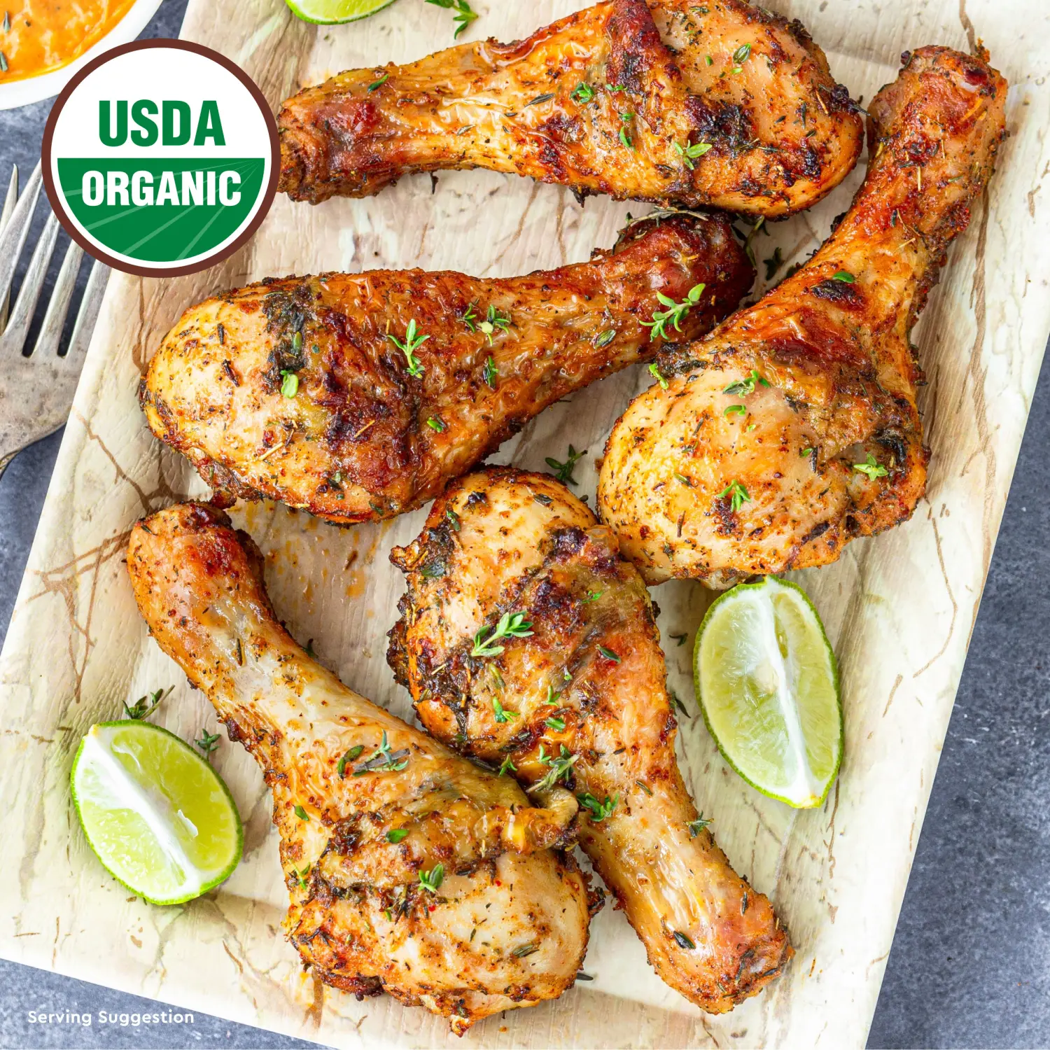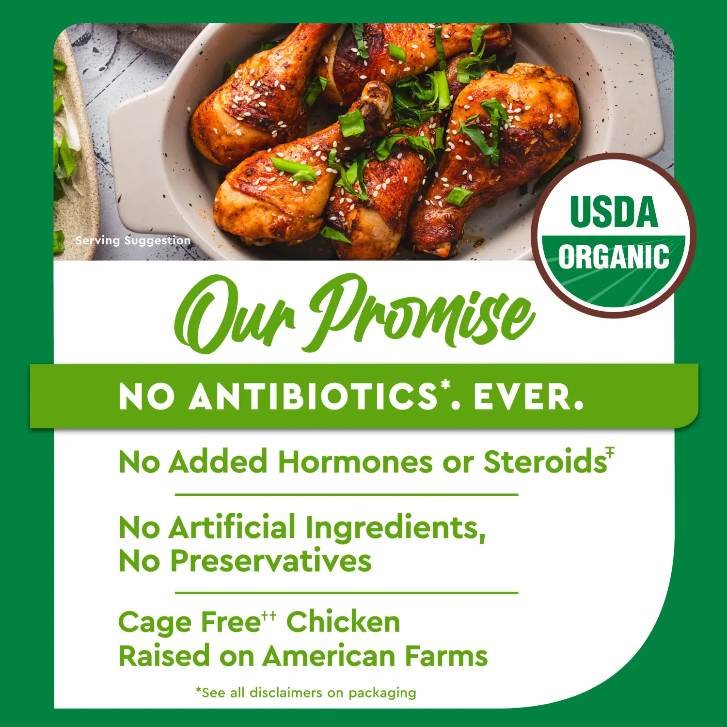 Our USDA Certified Organic Chicken Drumsticks are 100% premium dark meat, easy to prepare, and delicious to eat. These drumsticks will be a hit at dinner! As always, Just Bare® provides chicken that features no antibiotics, ever*. Has no added hormones or steroids†. Uses no artificial ingredients or preservatives and uses chickens raised cage free on American farms‡.