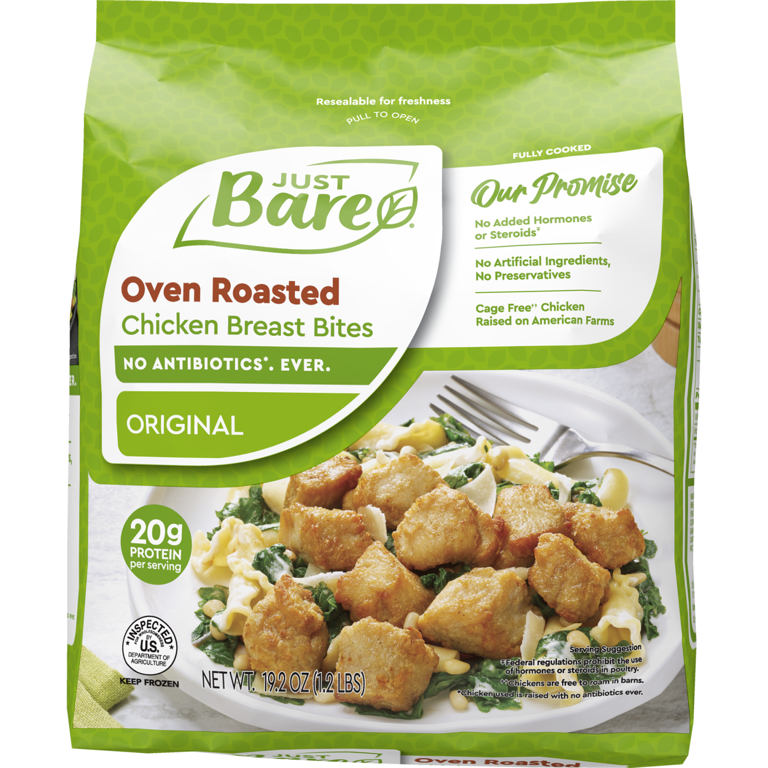 Introducing Just Bare Oven Roasted Original Chicken Breast, bringing you simply seasoned chicken breast with oven-roasted flavors to your meals. This fully cooked, whole muscle chicken breast is made with a savory seasoning blend and a subtle hint of garlic. Conveniently ready in minutes, this versatile protein is ideal for busy days and effortless meal prep. Whether tucked into wraps, layered in sandwiches, or paired with fresh salads, it fits into your routine without compromising quality or taste. Like all Just Bare products, the chicken is raised cage-free on American farms‡, contains no antibiotics ever*, has no added hormones or steroids†, and is free from artificial ingredients or preservatives.