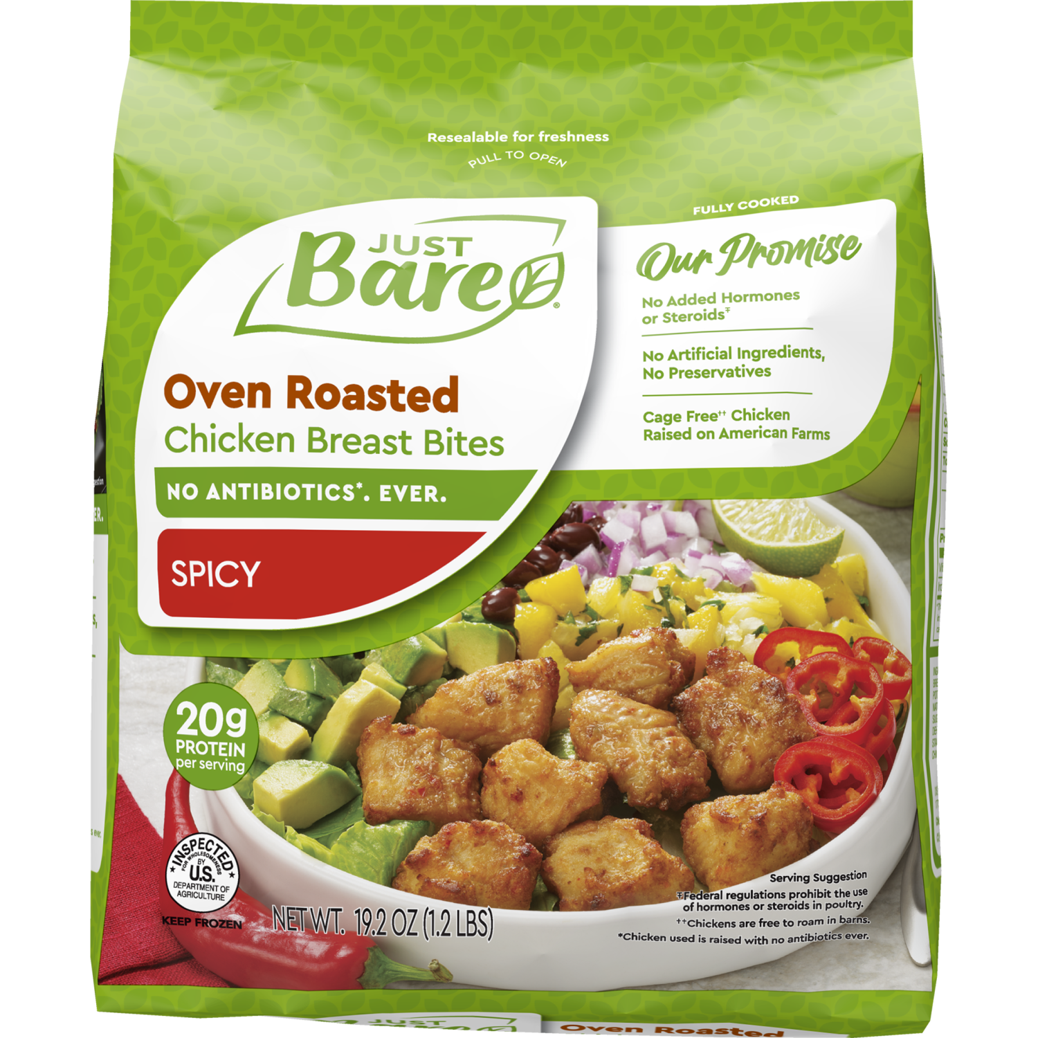 Introducing Just Bare Oven Roasted Spicy Chicken Breast, bringing bold and balanced flavor to your meals. This fully cooked, whole muscle chicken breast is seasoned with savory spices, delivering a kick of heat. Conveniently ready in minutes, this versatile protein is ideal for busy days and effortless meal prep. Whether tucked into wraps, layered in sandwiches, or paired with fresh salads, it fits into your routine without compromising quality or taste. Like all Just Bare products, the chicken is raised cage-free on American farms‡, contains no antibiotics ever*, has no added hormones or steroids†, and is free from artificial ingredients or preservatives.