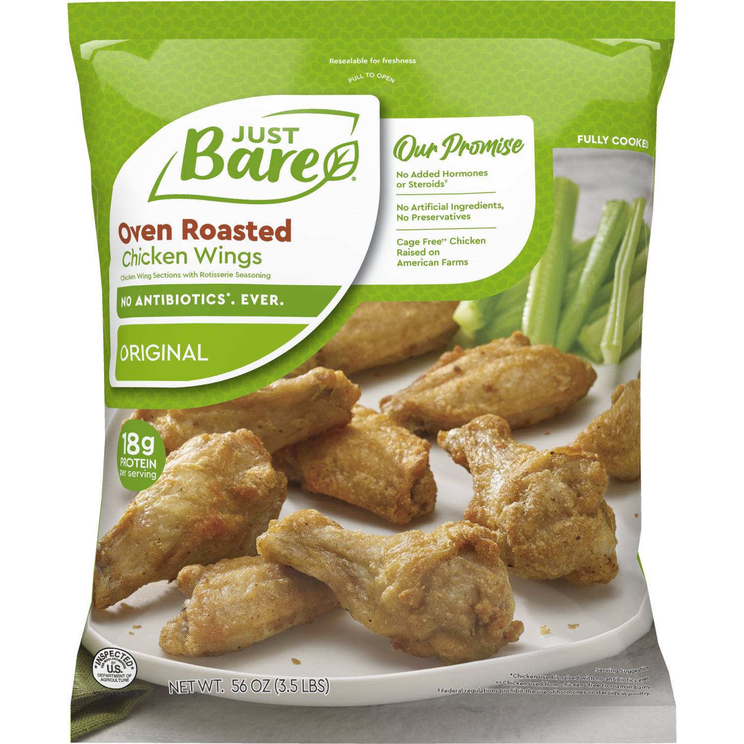 Introducing Just Bare Oven Roasted Original Chicken Wings – simple, savory, and ready when you are. These fully cooked, frozen wings are seasoned with a classic blend of herbs and spices, delivering oven-roasted flavor in every bite. Perfect for quick meals, game day spreads, or weeknight cravings, they go from freezer to plate in minutes. Like all Just Bare products, the chicken is raised cage-free‡ on American farms, contains no antibiotics ever*, has no added hormones or steroids†, and is free from artificial ingredients or preservatives.