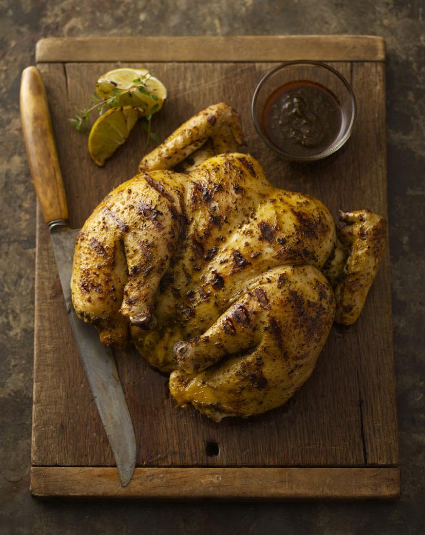 This herb paste used to flavor the chicken can be slathered on just before popping it onto the grill. Otherwise, try gently loosening the bird’s skin with your fingers, then rubbing the paste directly onto the meat under the skin. This combination of seasonings is called charmoula—sort of a North African pesto.