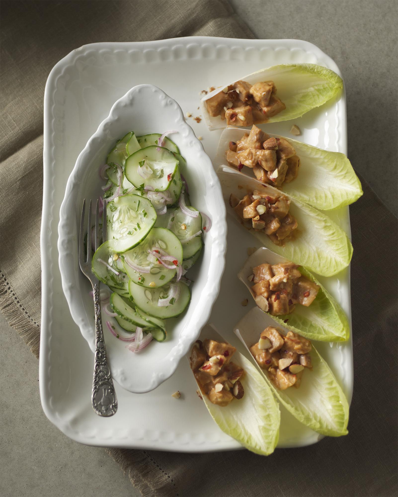 A lightly pickled cucumber salad—sliced and tossed with paper-thin red onions and seasoned rice vinegar—is a nice crisp complement to these rich endive bites. Chop either white or dark chicken to make the creamy salad to spoon into each endive leaf. If you’d like, garnish each bite with a fresh cilantro leaf.