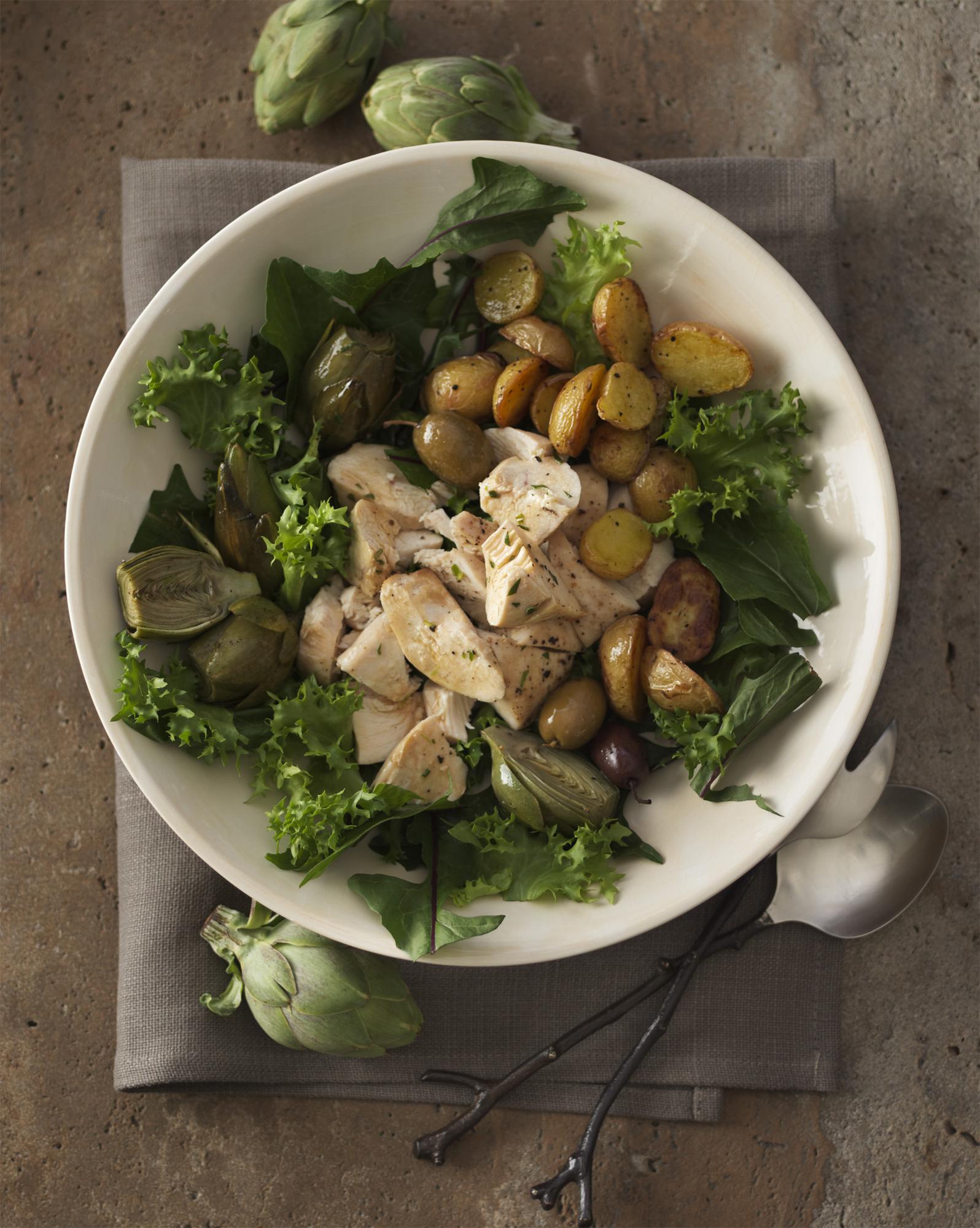 - Cut chicken into bite-size pieces. Arrange greens on plates; top with artichokes, potatoes, and chicken. Drizzle with remaining dressing and garnish with olives.