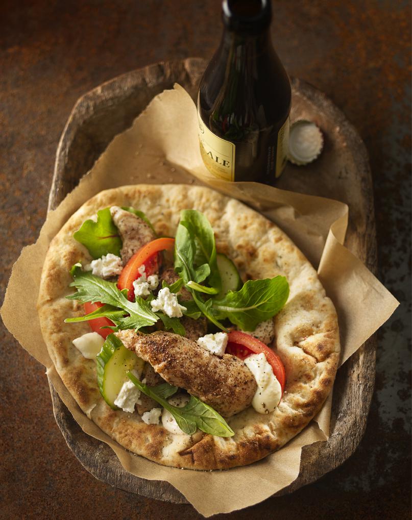 - To make wraps, mix hummus and yogurt in small bowl. Arrange spiced chicken tenders on pita bread, with greens, tomatoes, and cucumber. Drizzle with hummus sauce and sprinkle with feta.