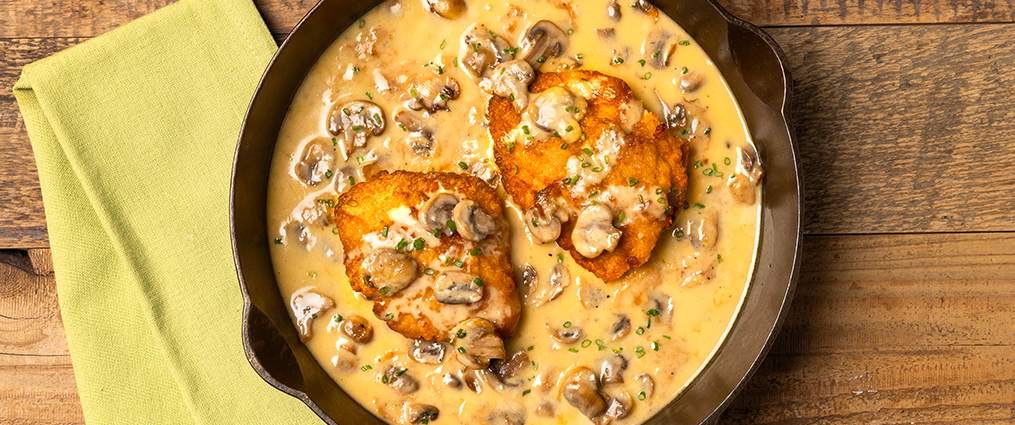 - Plate the sauce onto a plate and add the Lightly Breaded Chicken Fillet on top. Garnish with chives.