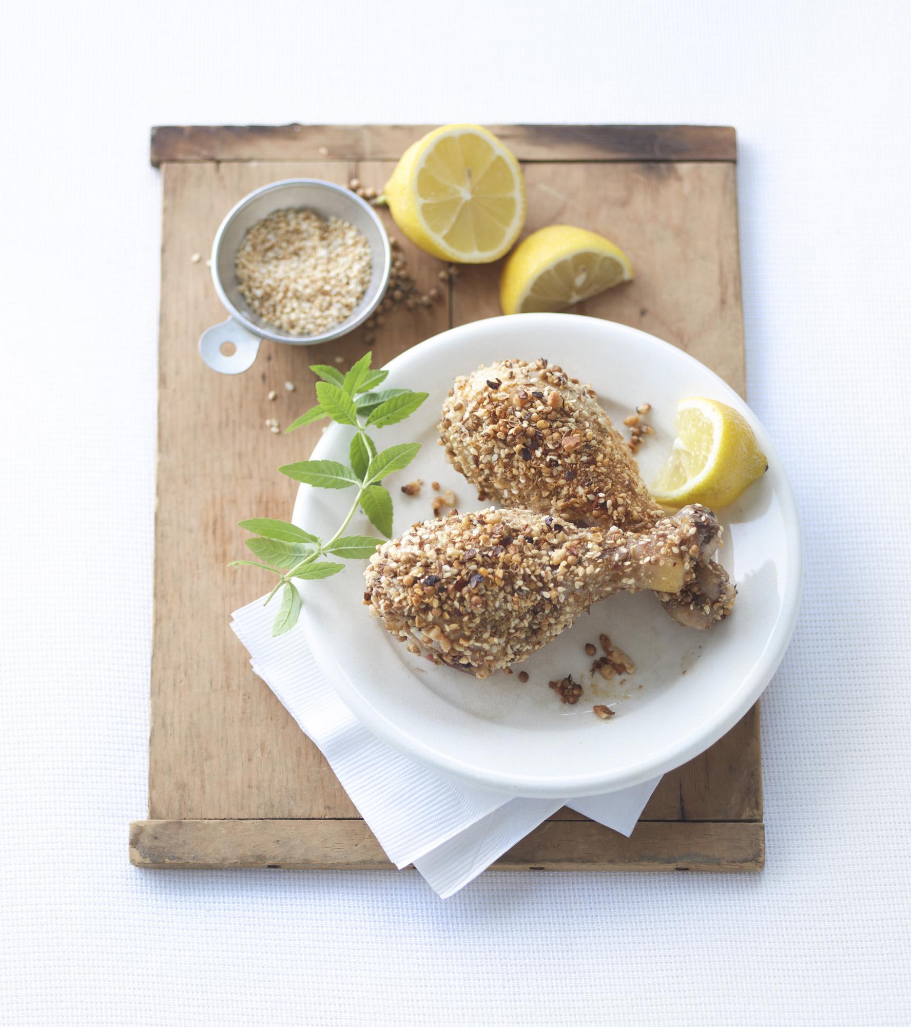 Rub drumsticks with oil; coat with nut-spice mixture. Arrange on prepared baking pan; roast about 25 minutes or until chicken is no longer pink near bone. Cook to internal temp of 165°F.