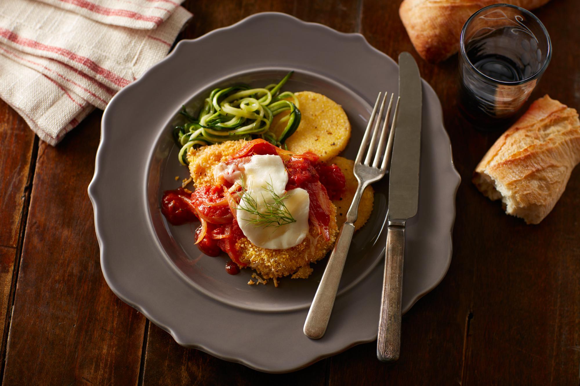 Serve this fresh take on a classic with crispy fried polenta and sautéed julienned zucchini with lots of fresh garlic. Pan-fry the chicken in olive oil if you’d like a crispier coating.