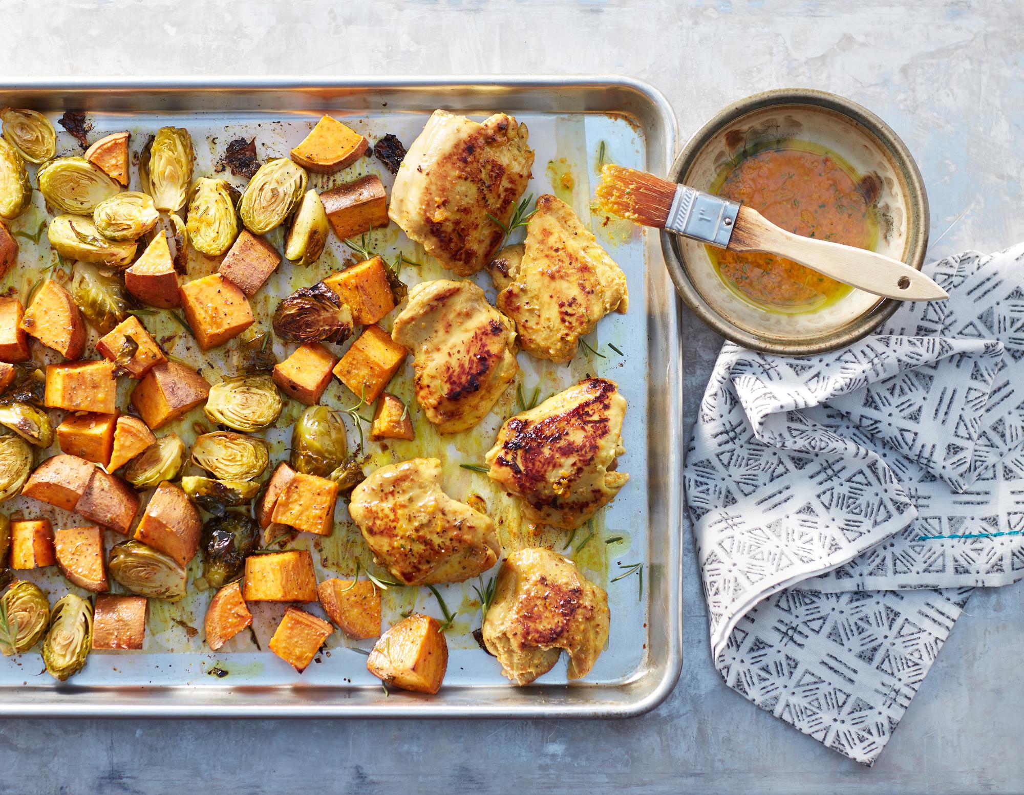 A large half-sheet baking pan is an essential kitchen tool; fill them up with well-seasoned chicken and any combination of your favorite roasting veggies. The key to even cooking is being sure everything is cut up into similar sizes—and chicken thighs need a little longer to cook so team up well with root vegetables. One-pan dinners are not only efficient to make, they’re even easier to clean up.