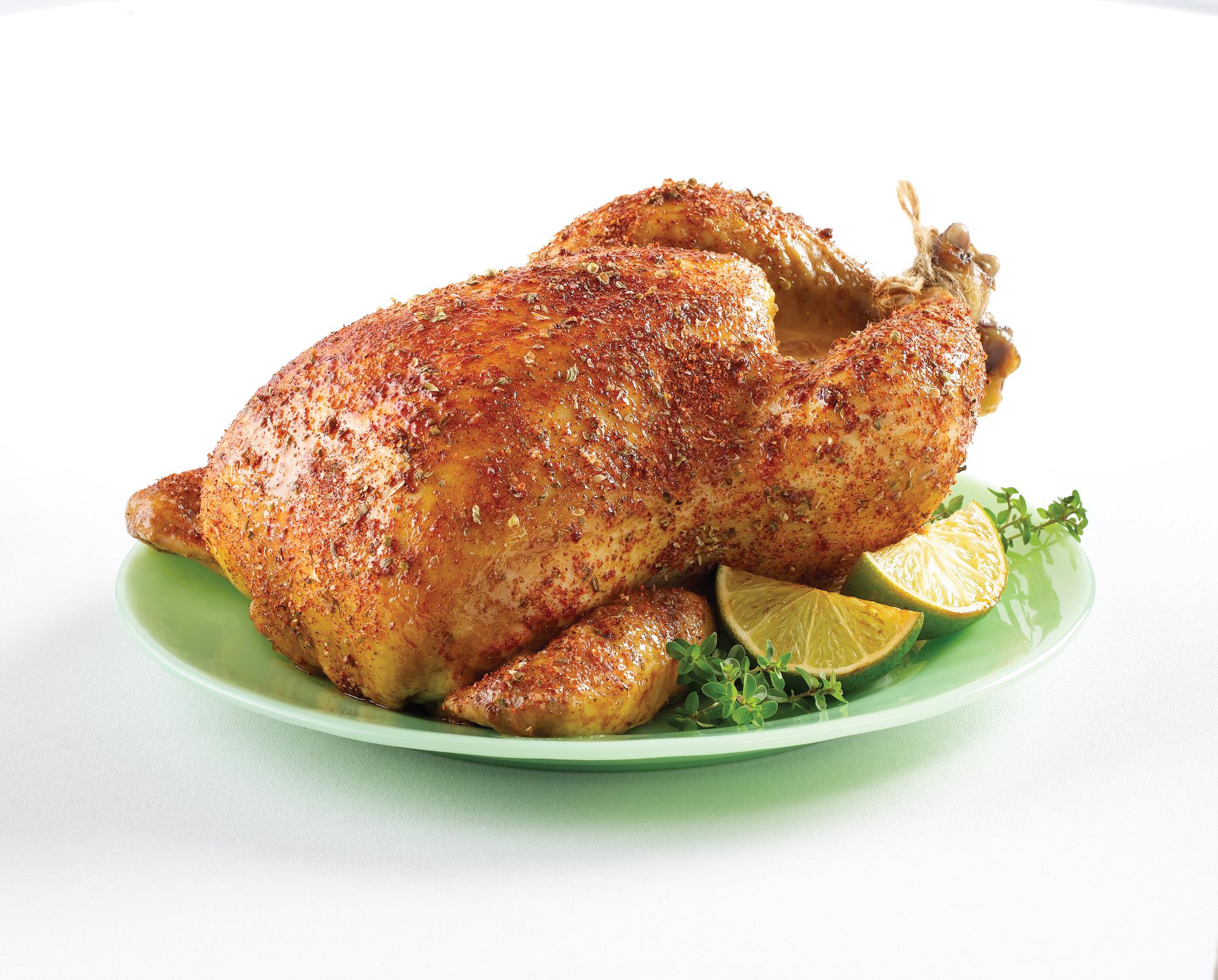 Heat oven to 425°F. Line a 15×10-inch rimmed baking pan with foil. Place chicken on pan. Cut limes into 4 wedges each; place 2 wedges inside chicken; tie legs together with kitchen twine and tuck wing tips under.